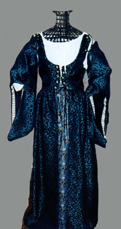 Italian Rennaissance GownThe bodice and overskirt is made of pink satin. The underskirt is an ivory damask. It is trimed in antique gold. The matching 2 piece pink satin gauntlets tie on over the attached chiffon sleeves. The dress is closed in the back with a laced gold cord through gold gromets over a modesty panel. | ![]() |